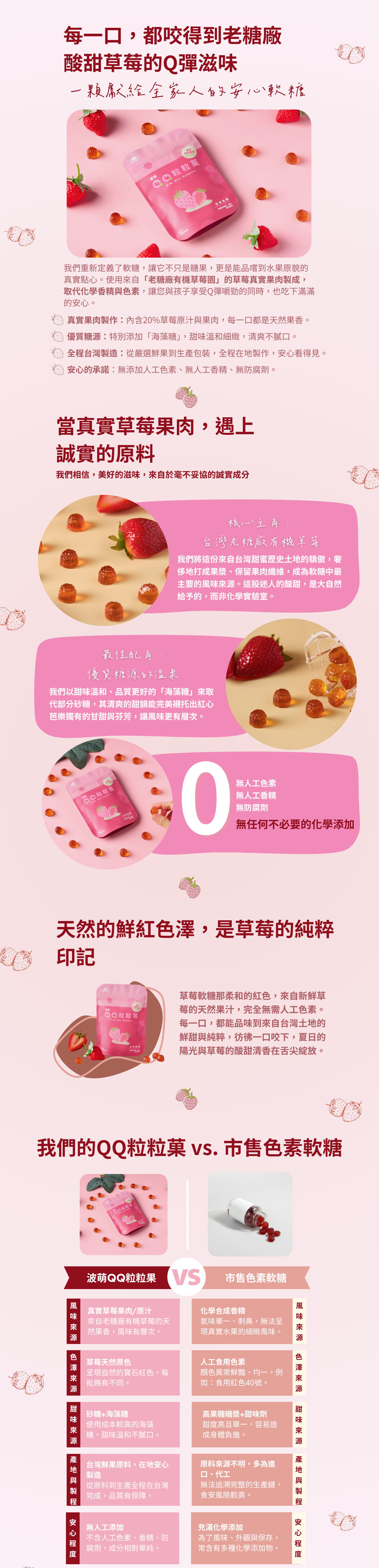 這款草莓味的波萌QQ粒粒菓選用了台灣有機草莓,將草莓的鮮甜與濃郁香氣完美封存在每一顆糖果中。Q彈的口感,保留了草莓的自然風味,⭕無人工色素、⭕香料或⭕防腐劑,讓您品味到最純粹的草莓美味。低糖的配方,讓您在享受草莓甜美的同時,也兼顧健康,是您日常不可或缺的甜蜜選擇。