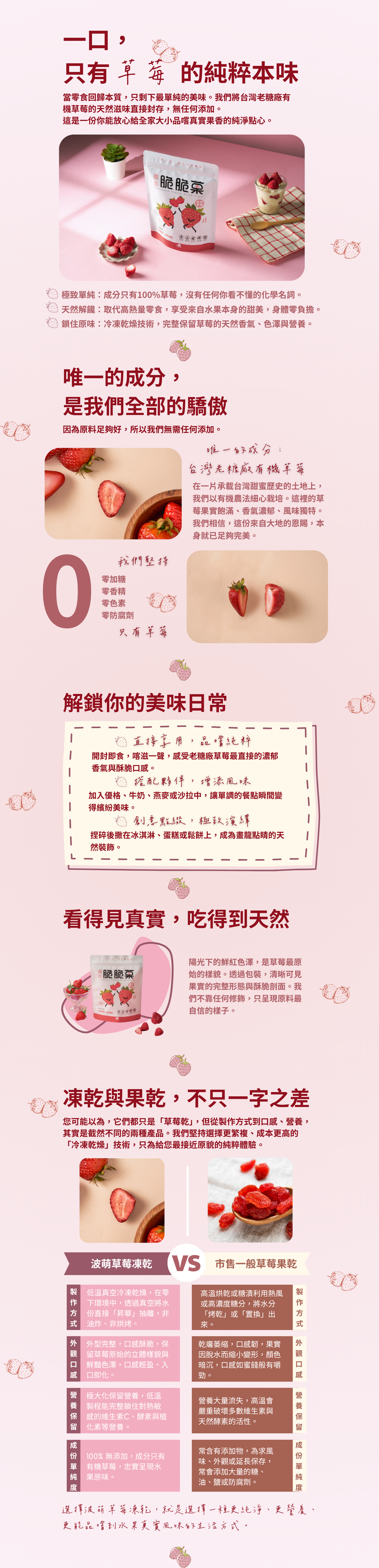 來自台灣鮮採草莓的凍乾零食,帶給您前所未有的酸甜滋味!這款「草莓凍乾」由波萌農場新鮮有機草莓製作而成,將水果的天然香氣與營養鎖進每一口酥脆中。